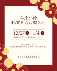 - 年末年始休業期間(2025/12/27~2026/1/4)のお知らせ師走の候、ますますご清栄のこととお慶び申し上げます。本年は格別のご愛顧を賜り、厚くお礼申し上げます。 さて、誠に勝手ながら、年末年始期間は下記の通り休業いたします。 【年末年始休業期間】2025年12月27日(土)~20 […]